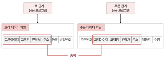 -고객 주소가 바뀔 때 2개 파일 모두를 수정하지 않으면 동일한 고객의 주소가 파일마다 달라 데이터 불일치 발생