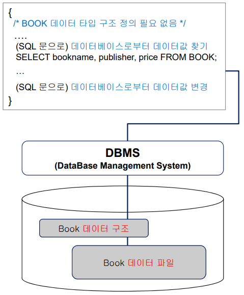 - BOOK 데이터 구조와, 데이터 값이 모두 데이터베이스에 저장됨 ( 프로그램은 데이터 구조와 데이터 값을 포함하지 않음)