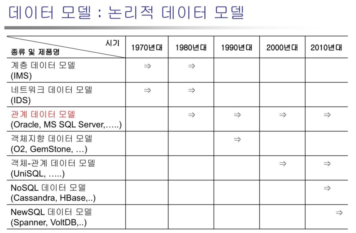 - 예: 관계 데이터 모델 (relational data model), 객체 데이터 모델, 객체-관계 데이터 모델, 네트워크 데이터 모델, 계층 데이터 모델,,,,을 이용해서 논리적 데이터 모델링을 한다.